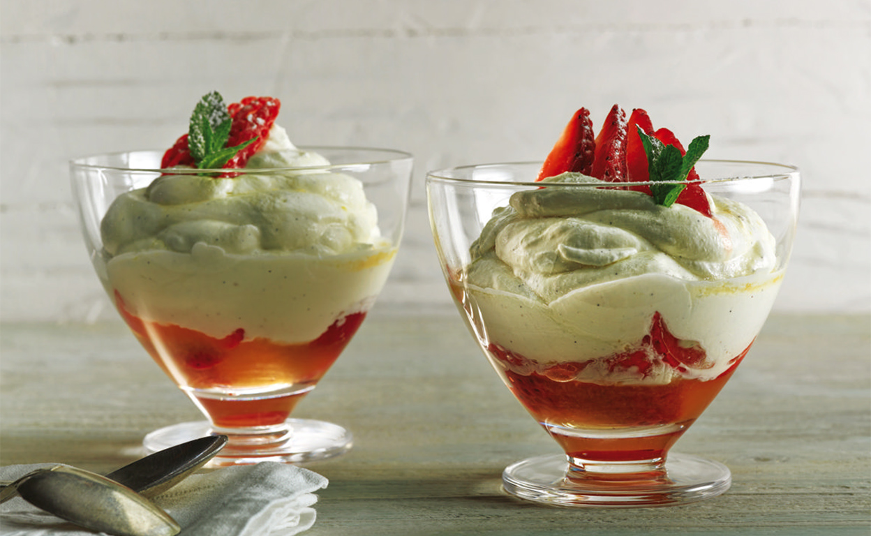 4. Se colocan en copas las fresas maceradas con la miel y el zumo. Se cubren con el chantilly y se sirven.