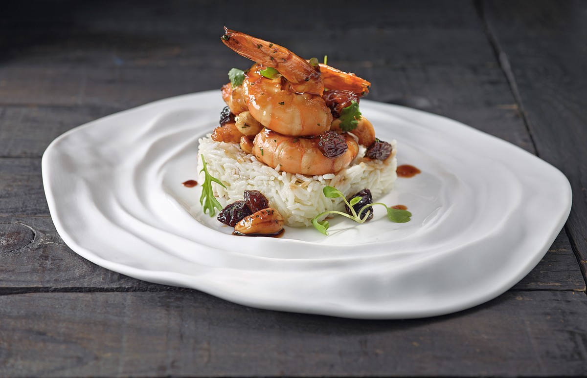 4. En una sartén con una pizca de aceite se doran los anacardos, las pasas escurridas y las colas de los langostinos salpimentados, se le dan unas vueltas rápidas y se incorporan la salsa caliente, el zumo del limón y la mantequilla.