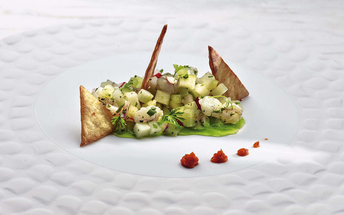 Acabado: para el ceviche de langostinos, se juntan todos los ingredientes en un bol, se rectifica el sazonamiento y se deja reposar unos 5 minutos al frío, para que los elementos se integren bien. Para servirlo, se menea con una cuchara la gelatina de manzana con el fin de volverla cremosa y colocarla en el fondo de un plato, colocando encima el ceviche o aguachile de langostinos. Alrededor se disponen las tortillas fritas, los brotes tiernos de cilantro fresco y el mojo habanero, que podremos servir aparte en un bol o manchando la vajilla.