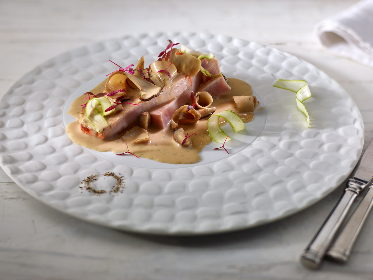 3. Acabado y presentación: en el mismo puchero se añade la mantequilla y se saltean los hongos durante 2 minutos aproximadamente, sin dejar de dar vueltas para que se cocinen por todos sus lados. Se salpimientan. Luego se añade el caldo de carne reducido y convertido en jugo, se incorpora la nata y se devuelven al fondo los filetes de lomo cocinados y reservados. Se da un ligero hervor de un minuto hasta que espese la salsa, sin que la carne se seque. Entonces se añade el vinagre de Jerez, se le da unas vueltas y se sirve rápidamente. Se espolvorea el perifollo o el perejil picado y se rectifica el sazonamiento. Se sirve con tallos crudos de espárragos trigueros cortados en láminas muy finas, aliñadas con una pizca de aceite de oliva, sal y pimienta