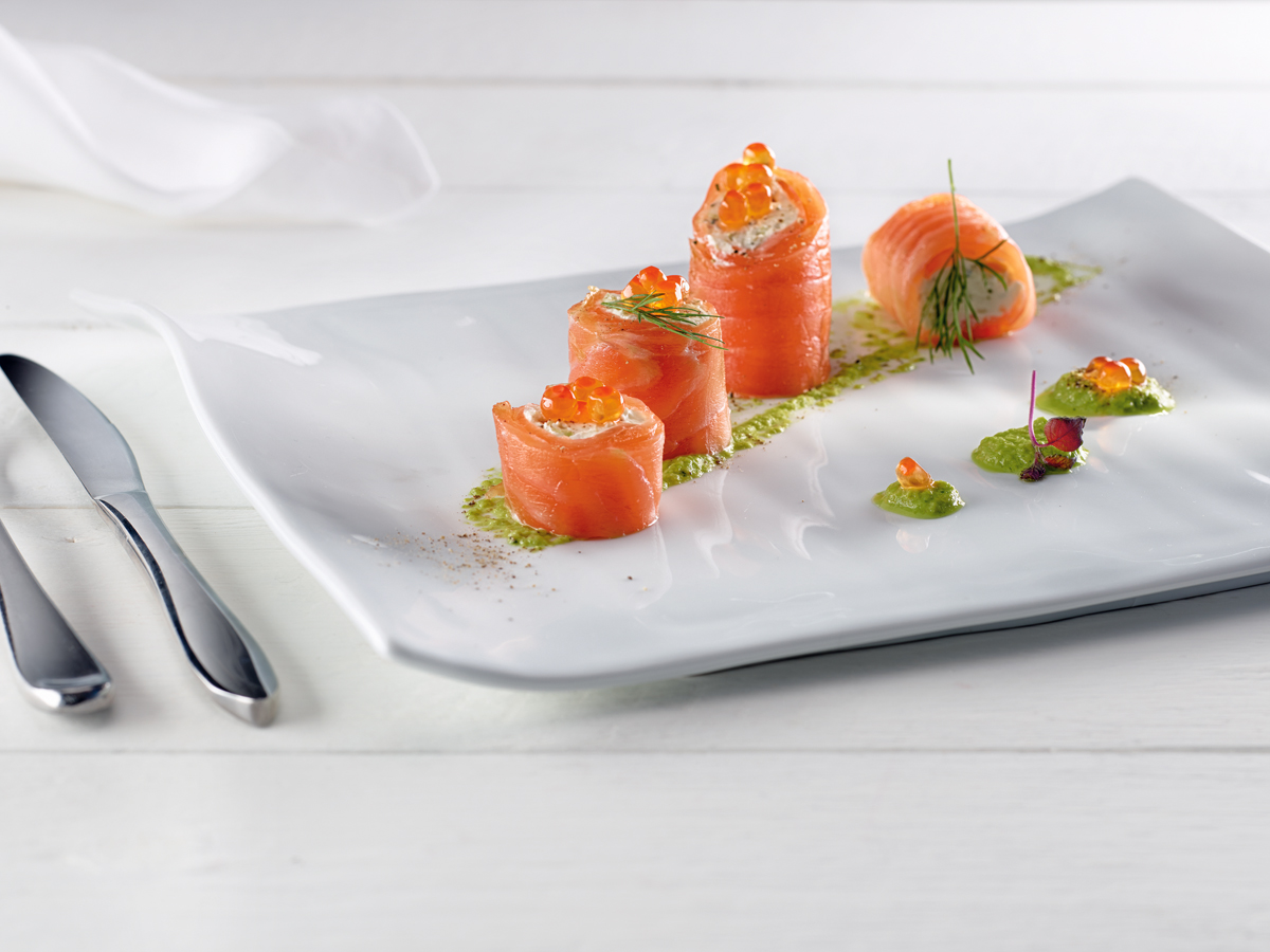 Para servirlos, acomodamos la salsa sobre la vajilla, en platos individuales o sobre una fuente, y repartimos con gusto los cilindros de salmón.