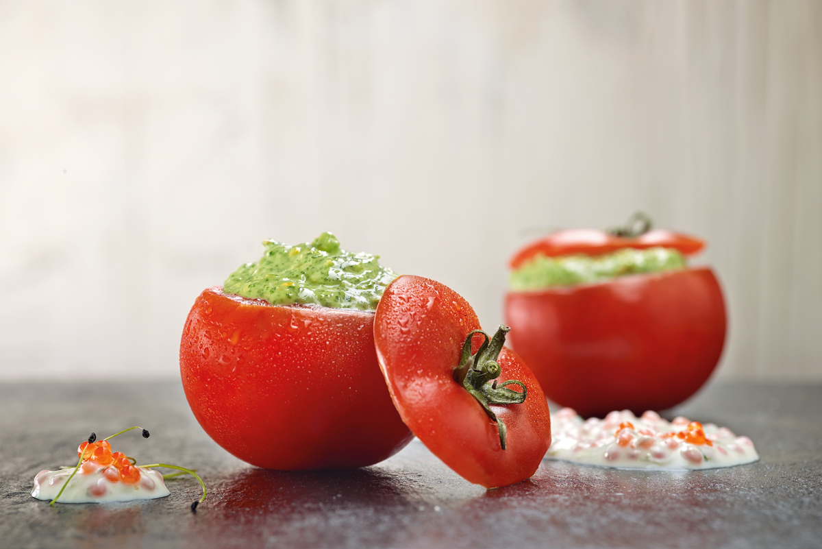 3. Acabado y presentación: se añaden a la mayonesa la ventresca desmenuzada, la albahaca y los huevos duros picados y, si es necesario, se rectifica de sal. Se rellenan los tomates con la mezcla y se termina colocando a cada tomate su 'sombrero' sin cerrar. Se mezcla el yogur griego con las huevas de trucha, el zumo y la ralladura de la lima. Para servir, se colocan los tomates en los platos y, junto a ellos, el yogur de huevas.
