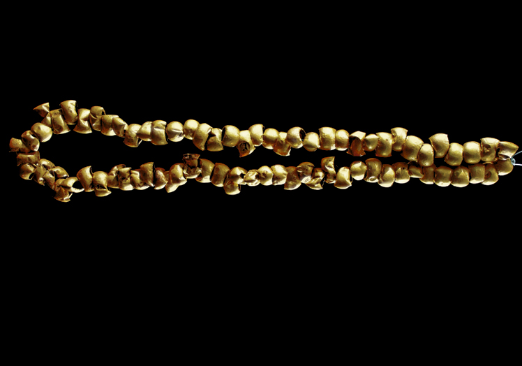 Cinturón de cuentas esféricas de oro encontrado en la tumba 1. Han aparecido también cuentas con dientes que se usaban como collares. A los conquistadores españoles les llamó mucho la atención que se adornasen con dientes de cocodrilo, de mono, de tiburón y hasta de humanos.