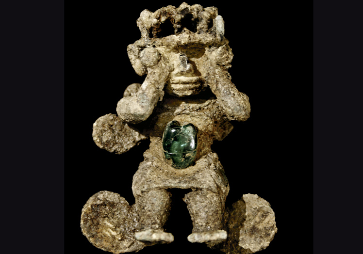 Figura que representa a un hombre autolesionándose. Se cree que se arrancaba los ojos para ofrecerlos en sacrificio a los dioses. En el pecho lleva una piedra preciosa. La presencia de grandes esmeraldas implica que los coclé intercambiaban riqueza y recursos con otras culturas.