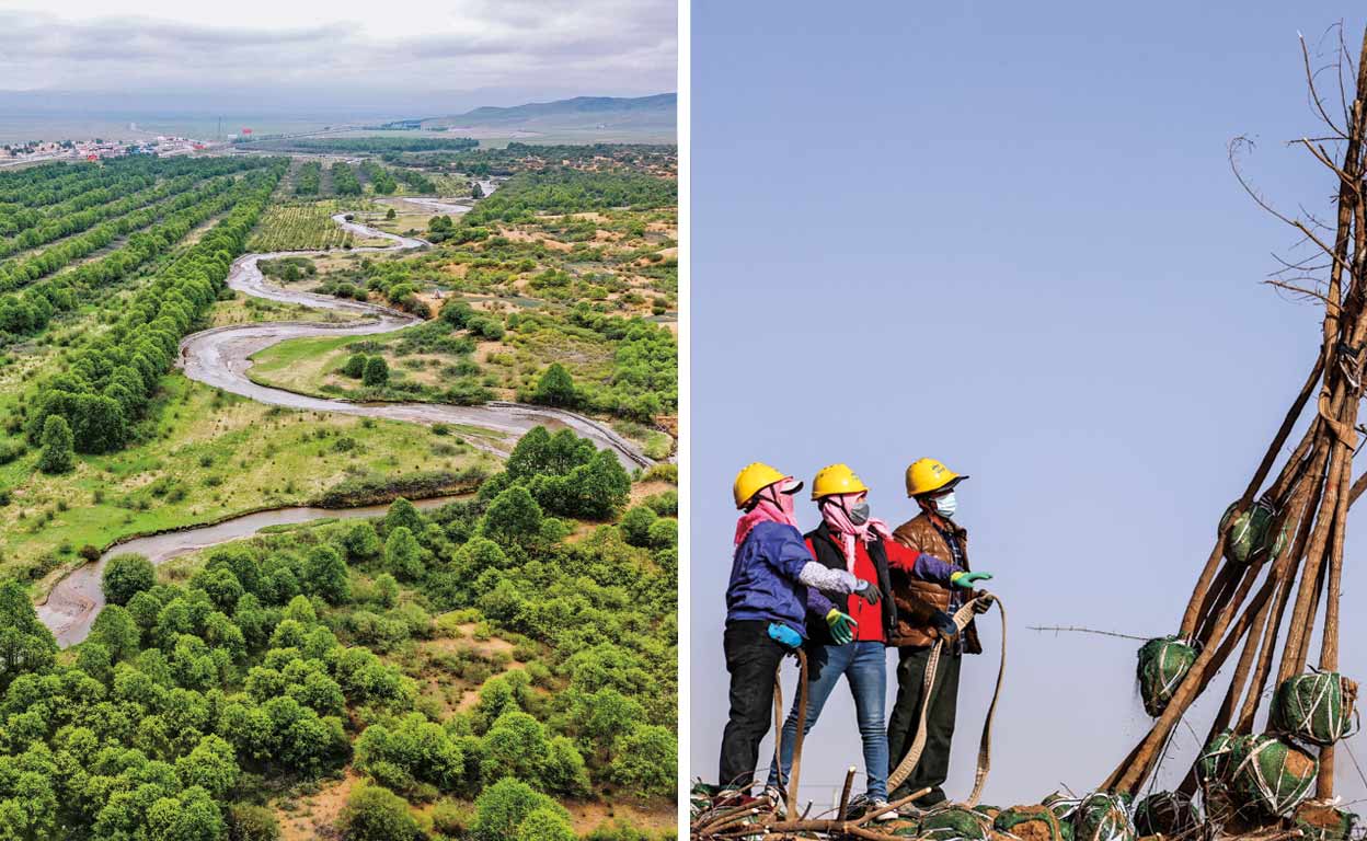 La Gran Muralla Verde africana (izda.) es un proyecto colosal: un cinturón verde que atraviesa el continente de oeste a este formado por una línea de bosques de 15 kilómetros de ancho y 8000 de longitud. Once países han acordado levantar esta barrera vegetal para frenar el avance del desierto. Dcha.: Plantación de árboles jóvenes en la región de Turkana (en Kenia), una zona azotada por terribles sequías. Fotos: Convención de las Naciones Unidas de Lucha contra la Desertificación / Ecosia