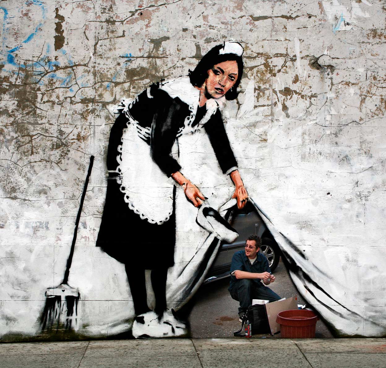 Se ríe cuando le confesamos que no entendemos la forma de operar de su amigo. Es sencilla, dice. «Fue el primero en utilizar esténcil. Estaba prohibido para un autor de grafiti, que debe trabajar a mano alzada. Pero con una plantilla vas rápido y llegas a todas partes. Es así como se pueden hacer ratas en todas partes en una noche. Son dos minutos, mecaniza el grafiti y por eso era un tabú». Permite también delegar sin asumir riesgos inútiles. «Por supuesto que tiene un equipo. Damien Hirst no hace él mismo sus pinturas y Jeff Koons no esculpe sus esculturas».