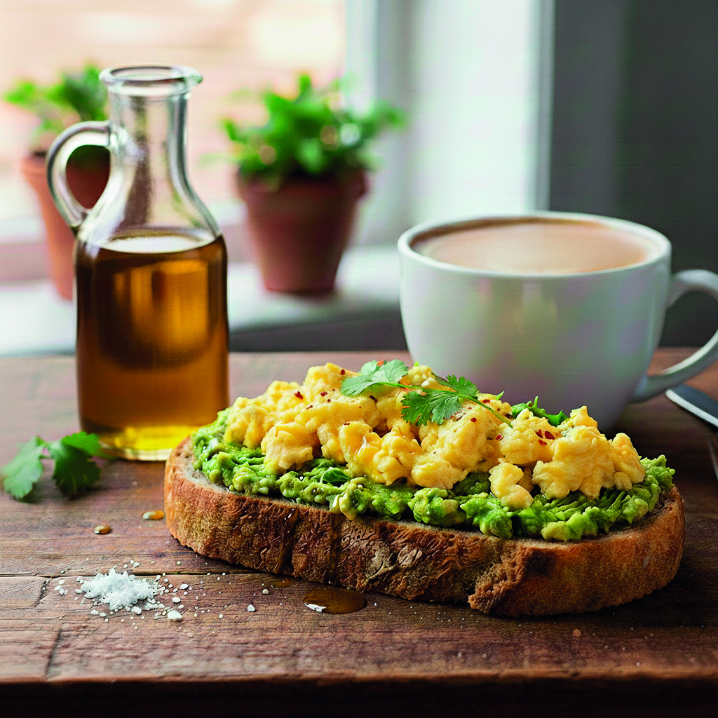«Una tostada de buen pan de hogaza de masa madre con aceite de oliva, aguacate y un huevo revuelto encima. Y un café con leche de avena».