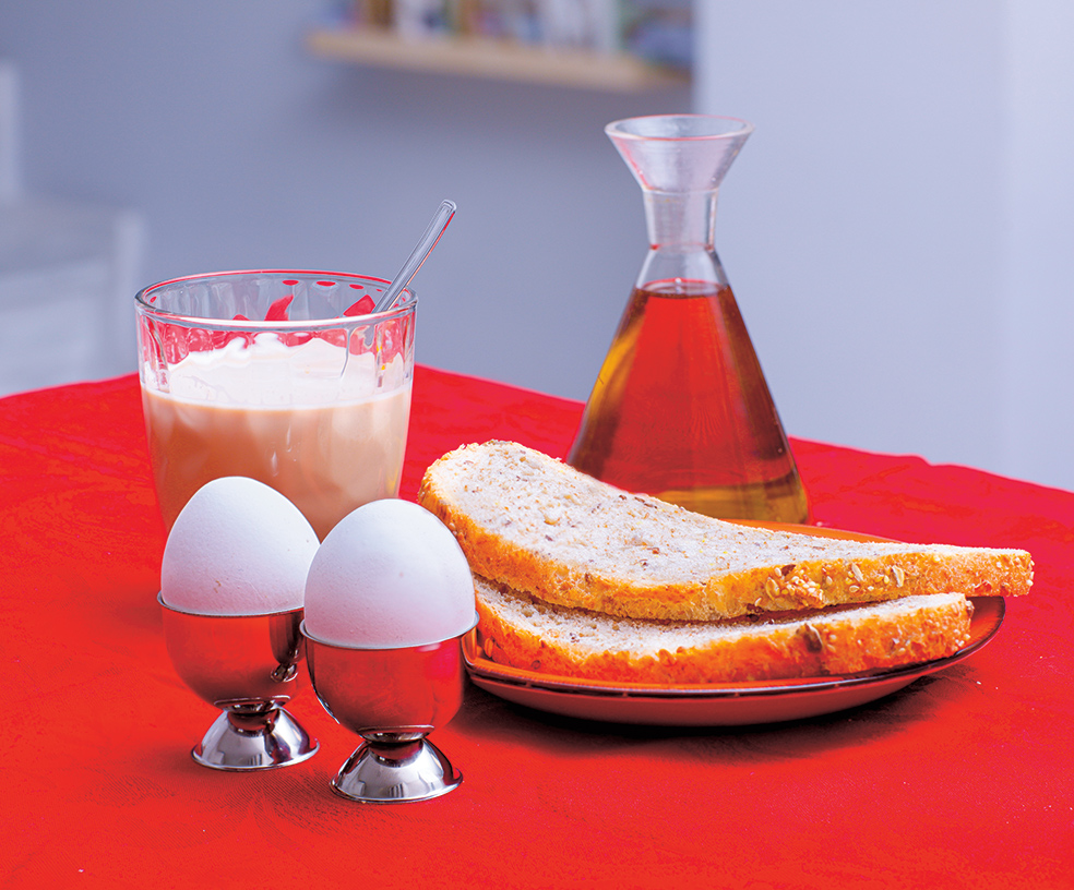 «Un par de huevos revueltos sobre una rebanada de pan integral de semillas (de masa madre) y un buen café con leche de avena».